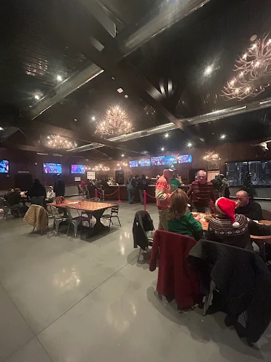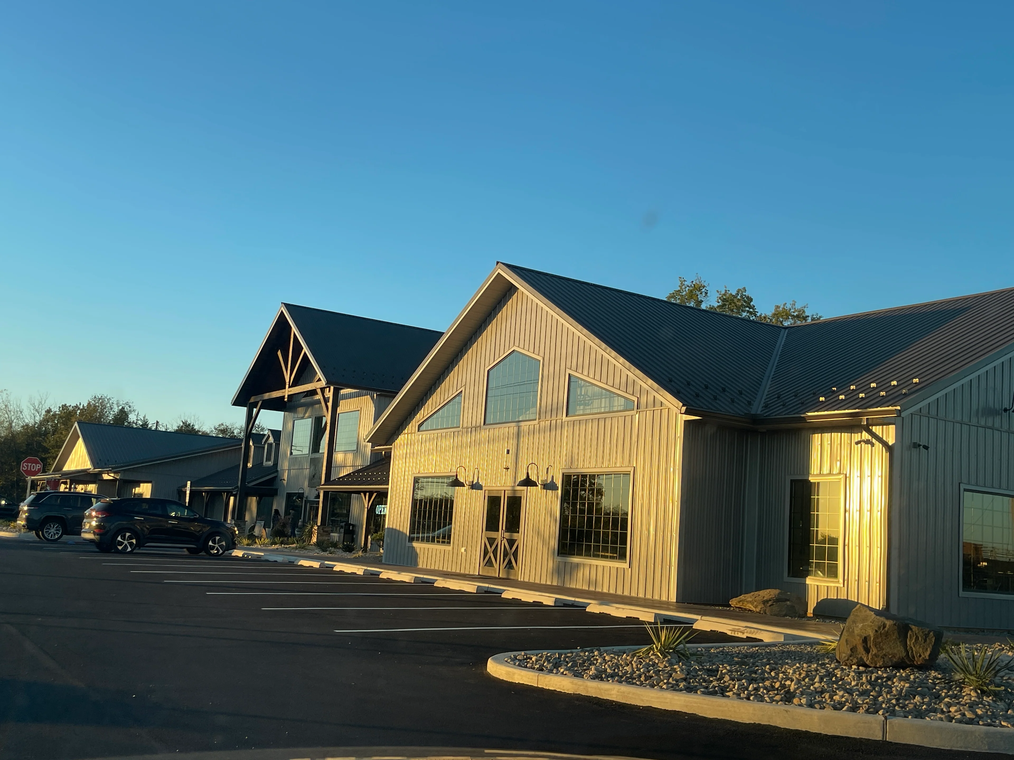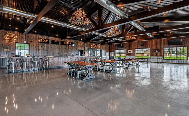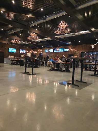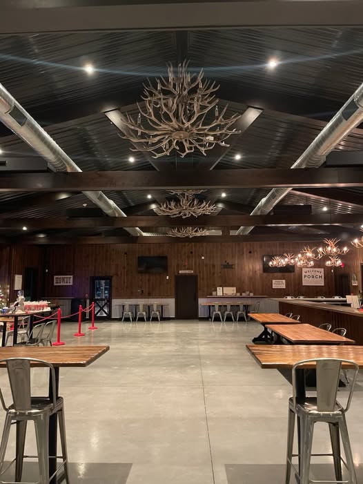 As soon as you step inside, you’re hit with a stunning “farm-barn” aesthetic. The timber-frame structure and soaring ceilings give the tasting room a massive, open feel, anchored by striking antler-inspired chandeliers and rustic western décor. It’s the kind of space built for a crowd—whether you’re there for a quiet flight or ready to join in on one of their regular country line dancing nights on the spacious floor.